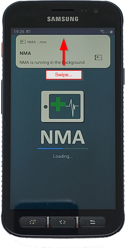 When the NMA app is loading, you will receive a message stating ‘NMA is running in the background’, tap or swipe up on this message to clear it