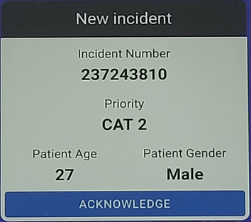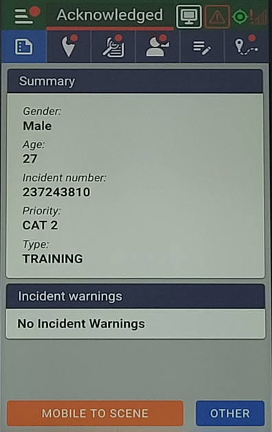 Tap ‘ACKNOWLEDGE’ to accept the task, a summary of the incident will be displayed. The Status bar will show that you have ‘Acknowledged’ the task